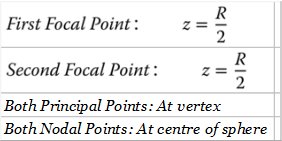 The focal length of a curved mirror is half the base radius, with both focal points co-located. In fact, the two focal lengths are of opposite sign. Again, this fits in with the notion that reflective surfaces act as media with a refractive index of −1. Both nodal points are co-located at the centre of curvature and the principal points are also co-located at the surface vertex.