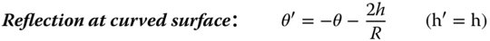 In form, Eq. (1.17) is similar to Eq. (1.14) with a linear dependence of the reflected ray angle on both incident ray angle and height. The two equations may be made to correspond exactly if we make the substitution, n1 = 1, n2 = −1. This runs in accord with the empirical observation made previously that a reflective surface acts like a medium with a refractive index of −1. Once more, the sign convention observed dictates that positive axial displacement, z, is in the direction from left to right and positive height is vertically upwards. A ray with a positive angle, θ, has a positive gradient in h with respect to z.