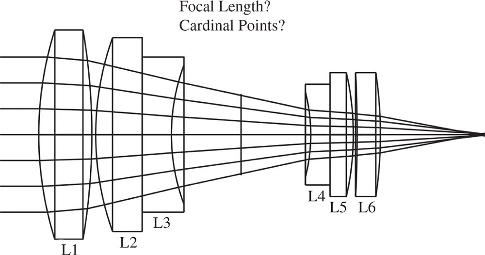 In Section 1.4 we looked at the behaviour of some very simple components, mirrors and lenses, deriving the locations of the Cardinal Points. As discussed previously, the Cardinal Points provide a complete description of the first order properties of an optical system, no matter how complex.