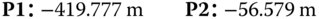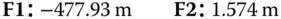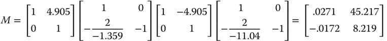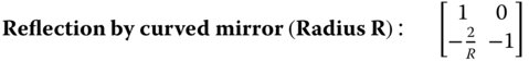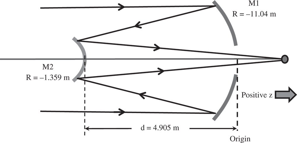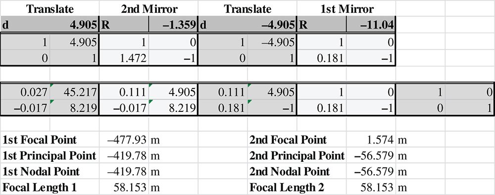 There are four matrix elements to consider here. First, there is a mirror with a radius of −11.04 m (note sign), followed by a translation of −4.905 m (again note sign). The third matrix element is a mirror (M2) of radius − 1.359 m. Finally, we translate by +4.905 m, so that both the input and output co-ordinates are referenced with respect to the same origin. The matrices are as below:
