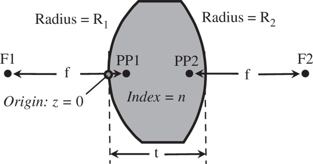 Figure 1.14 shows a lens made up of two spherical surfaces, of radius, R1 and R2. Once again, the convention is that the spherical radius is positive if the centre of curvature lies to the right of the relevant vertex.