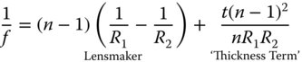 The formula above is similar to the simple, ‘Lensmaker’ formula for a thin lens. In addition there is another term, linear in thickness, t, which accounts for the lens thickness.