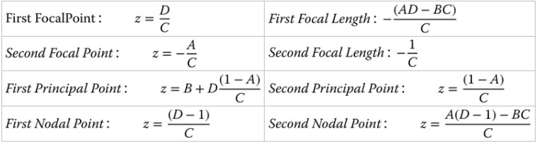 The matrix above represents the system matrix after propagating through all optical elements as shown in Figure 1.17. However, the convention adopted here is that an additional transformation is added after the final surface. This additional transformation is free space propagation to the original starting point. It must be emphasised that, this is merely a convention, and that the final step traces a dummy ray as opposed to a real ray. That is to say, in reality, the light does not propagate backwards to this point. In fact, this step is a virtual back-projection of the real ray which preserves the original ray geometry. The logic of this, as will be seen, is that in any subsequent analysis, the location of all cardinal points is referenced with respect to a common starting point. If this step were dispensed with, then the three first Cardinal Points would be referenced to the start point and the three second Cardinal Points to the end point. With this in mind, the Cardinal Points, as referenced to the common start point are set out below; the reader might wish to confirm this.