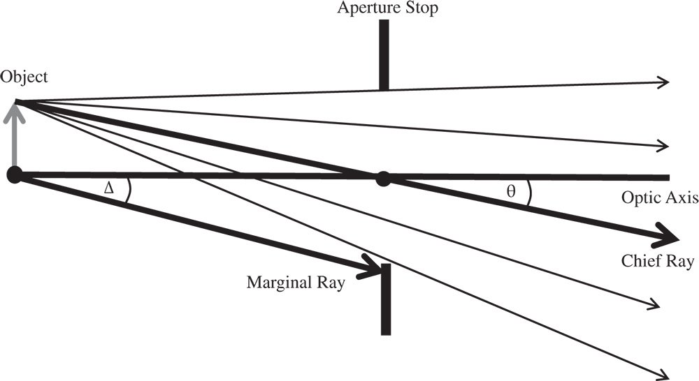 The aperture stop is the principal means for controlling the passage of rays through an optical system. Ideally, this would be the only component that controls the admission of light to the optical system. In practice, other optical surfaces located away from the aperture stop may also have an impact on the admission of light into the system. This is because these optical components, for reasons of economy and other optical design factors, have a finite aperture. As a consequence, some rays, particularly those for larger field angles, may miss the lens or component aperture altogether. So, in this case, for field positions furthest from the optical axis, some of the rays will be clipped. This process is known as vignetting. This is shown in Figure 2.5.