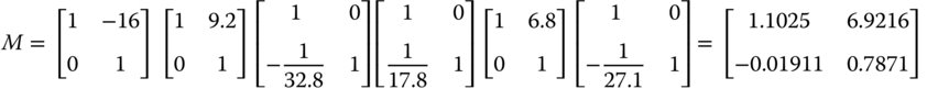 The distance between the first and second lenses is 6.8 mm and between the second and third lenses is 9.2 mm. By convention, we retrace dummy rays −16 mm back to the origin at the first lens, so that all matrix ray tracing formulae are referred to a common origin. The matrix for the system is given below: