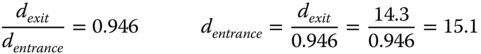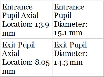 The location of the entrance pupil expressed as an object distance is 52.3 − 55.1 or −2.8 mm. Similarly the location of the exit pupil expressed as an image distance is equal to −49.65 + 52.3 or +2.65 mm. The magnification (image/object) is, in this instance equal to 2.65/2.8 or 0.946. Therefore we have: