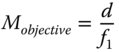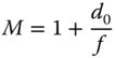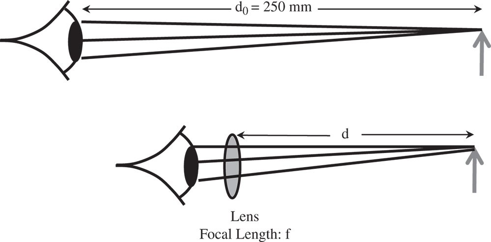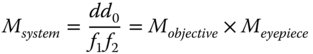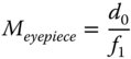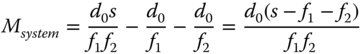The logic of Eq. (2.9) is that a shorter system focal length can be created than would be reasonably practical with a single lens. Using the same definition as used for the simple magnifying lens, the effective system magnification, Msystem, is given by the ratio of the closest approach distance d0, (250 mm), and the system focal length. The system magnification, is given by: