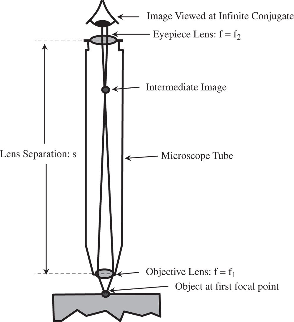 In the preceding subsection, the limitations of a simple magnifying lens were made clear. Overall, its functionality, in delivering a high magnification, is to convey an intermediate image, located at the infinite conjugate, to the human eye. Furthermore, to provide maximum magnification, the focal length of this lens must be as small as possible. For practical reasons, a magnification of greater than ×10 cannot be delivered. This difficulty is solved by the compound microscope where a two-lens system is used to provide a system focal length that is considerably shorter than would be afforded by a single lens. In essence, a compound microscope consists of two lenses, or lens groups. The first lens is the objective lens that lies close to the object and the second lens, in the traditional microscope, is the eyepiece. Of course, in many modern instruments, the eye is replaced by a pixellated detector chip. Nonetheless the logic followed here still applies. Figure 2.8 shows the general set up.