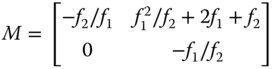 The angular magnification (the D value of the matrix) is simply −f1/f2. It is important to note the sign of the magnification, so that for two positive lenses, then the magnification is negative. In line with the previous discussion with regard to the optical invariant, the linear magnification (given by matrix element A) is the inverse of the angular magnification. Also, the C element of the matrix, attesting to the focal power of the system, is actually zero and is characteristic of an afocal system.