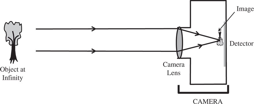 In defining the function of the camera, we spoke of the imaging of an object located at infinity. In this context, ‘infinity’ means a substantially greater object distance than the lens focal length. For the traditional 35 mm format photographic camera, a typical standard lens focal length would be 50 mm. The ‘35 mm’ format refers to the film frame size which was 36 mm × 24 mm (horizontal × vertical). As mentioned in Chapter 1, the focal length of the camera lens determines the ‘plate scale’ of the detector, or the field angle subtended per unit displacement of the detector. Overall, for this example, plate scale is 1.15° mm−1. The total field covered by the frame size is ±20° (Horizontal) × ±13.5° (Vertical). ‘Wide angle’ lenses with a shorter focal length lens (e.g. 28 mm) have a larger plate scale and, naturally a wider field angle. By contrast, telephoto lenses with longer focal lengths (e.g. 200 mm), have a smaller plate scale, thus producing a greater magnification, but a smaller field of view.