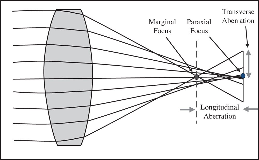 In the first two chapters, we have been primarily concerned with an idealised representation of geometrical optics involving perfect or Gaussian imaging. This treatment relies upon the paraxial approximation where all rays present a negligible angle with respect to the optical axis. In this situation, all primary optical ray behaviour, such as refraction, reflection, and beam propagation, can be represented in terms of a series of linear relationships involving ray heights and angles. The inevitable consequence of this paraxial approximation and the resultant linear algebra is apparently perfect image formation. However, for significant ray angles, this approximation breaks down and imperfect image formation, or aberration, results. That is to say, a bundle of rays emanating from a single point in object space does not uniquely converge on a single point in image space.