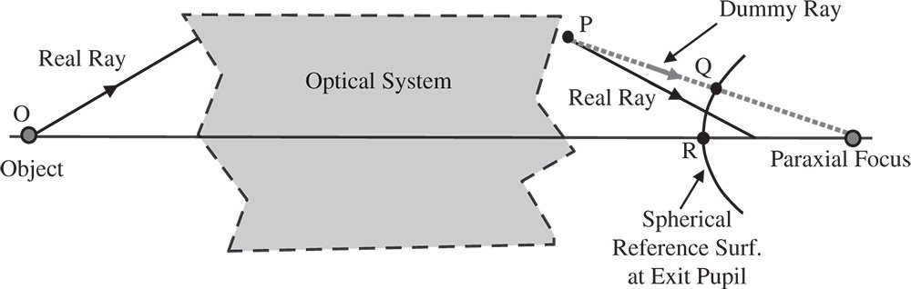 The general concept is shown in Figure 3.5. Rays are accurately traced from the object through the system, emerging into image space. That is to say, ray tracing proceeds until the last optical surface, mirror or lens etc. Following the preceding discussion, at some point, we force all rays to converge upon the paraxial focus. However, the convention for computing OPD is that all rays are traced back to a spherical surface centred on the paraxial focus and which lies at the exit pupil of the system. Of course, it must be emphasised that the real rays do not actually follow this path. In the generic system illustrated, the real ray is traced to point P located in object space and the optical path length computed. Thereafter, instead of tracing the real ray into the object space, a dummy ray is traced, as shown by the dotted line. This dummy ray is traced from point P to point Q that lies on the reference surface – a sphere located at the exit pupil and centred on the paraxial focus. The optical path length of this segment is then added to the total.