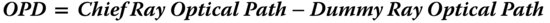After calculating the optical path length for the dummy ray OPQ, we need to calculate the OPD with respect to the chief ray. The chief ray path is calculated from the object to its intersection with the reference sphere at the pupil, represented, in this instance, by the path OR. In calculating the OPD, the convention is that the OPD is the chief ray optical path (OR) minus the dummy ray optical path (OPQ). Note the sign convention.