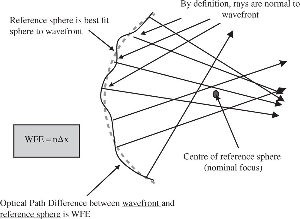 The sign convention is important, as it now concurs with the definition of OPD. As the wavefronts form surfaces of constant optical path length, there is a direct correspondence between OPD and WFE. A positive OPD indicates the optical path of the ray at the reference sphere is less than that of the chief ray. Therefore, this ray has to travel a small positive distance to ‘catch up’ with the chief ray to maintain phase equality. Hence, the WFE is also positive.