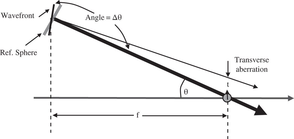 Both OPD and WFE quantify the violation of Fermat's principle in the same way. OPD is generally used to describe the path length difference of a specific ray. WFE tends to be used when describing OPD variation across an assembly of rays, specifically across a pupil. The concept of WFE enables us to establish the relationship between OPD and transverse aberration in that it helps define the link between wave (phase and path length) geometry and ray geometry. This is shown in Figure 3.7. It is clear that the transverse aberration is related to the angular difference between the wavefront and reference sphere surfaces.