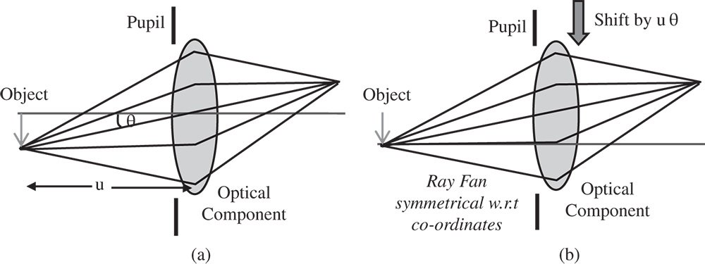 What is suggested by Figure 3.10 is that if a co-ordinate transformation is applied in y that is proportional to the field angle, θ, then the ray fan can be made symmetrical about this new optical axis. That is to say, in Figure 3.10b, any aberration generated would, in terms of OPD, simply be proportional to p4, with respect to the new axis. In arguing that the required offset is proportional to θ, rather than some other trigonometrical function, we are making an approximation based on linearization in θ. This is justified for third order analysis, since any error produced would only be visible in higher order aberration terms (than third order). In Figure (3.10), the pupil is shown at the optical surface under consideration. However, this is not a necessary condition; wherever the pupil is located a symmetrical ray fan may be produced by simple offset of the co-ordinate system in the Y axis.