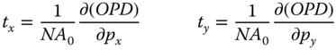 Equation (3.12) provides a simple direct relationship between OPD and transverse aberration. Of course, we know that, for third order aberration, the transverse aberration is proportional to the third power of the pupil function, p. If this is the case, then it is apparent, from Eq. (3.12), that the OPD is proportional to the fourth power of the pupil function. So, for third order aberration, the transverse aberration shows a third power dependence upon the pupil function whereas the OPD shows a fourth power dependence.