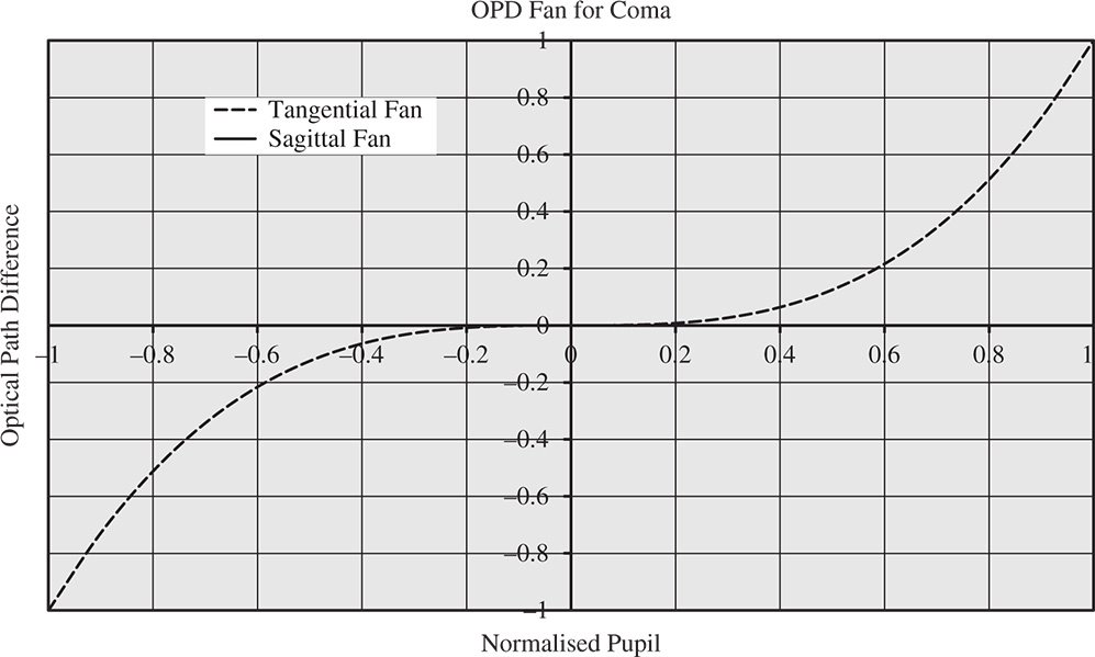 At this stage it will be useful to summarise the five Gauss-Seidel aberrations in terms of the pupil and field dependence of their OPD and ray fans. It should be noted that for all Gauss-Seidel aberrations, the order of the pupil dependence and the order of the field angle dependence sum to four (for the OPD). In particular, it is important for the reader to understand how the different types of aberration vary with both pupil size and field angle. For example, in many optical systems, such as telescopes and microscopes, the range of field angles tend to be significantly smaller than the larger angles subtended to the pupil. Therefore, for such instruments, those aberrations with a higher-order pupil dependence, such as spherical aberration (4) and coma (3), will predominate.