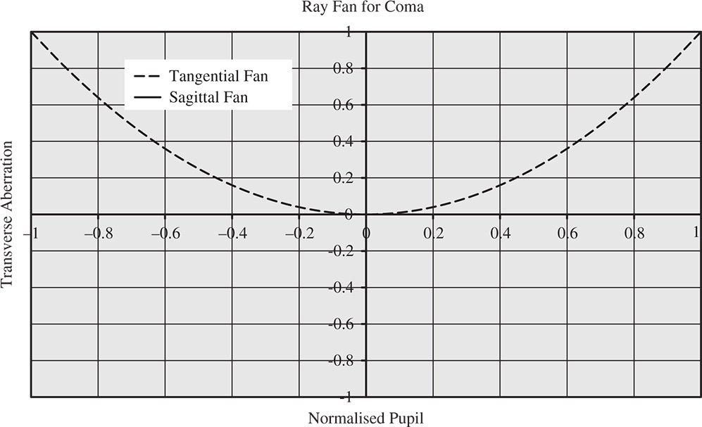 It is clear from Eq. (3.27) that the pattern produced is a series of overlapping circles of radius A√2p2 offset in y by 2Ap2. Coma is not an aberration that can be ameliorated or balanced by defocus. When analysing transverse aberration, the impact of defocus is to produce an odd (anti-symmetrical) additional contribution with respect to pupil function. The transverse aberration produced by coma, is, of course, even with respect to pupil function, as shown in Figure 3.12. Therefore, any deviation from the paraxial focus will only increase the overall aberration.