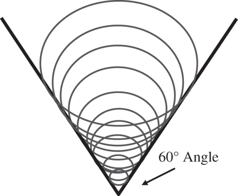 Figure 3.14 shows the characteristic geometrical point spread function associated with coma, clearly illustrating the overlapping circles corresponding to successive pupil rings. These overlapping rings produce a characteristic comet tail appearance from which the aberration derives its name. The overlapping circles produce two asymptotes, with a characteristic angle of 60°, as shown in Figure 3.14.