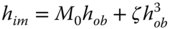 Taken together with the linear (paraxial) magnification produced by a perfect Gaussian imaging system, distortion introduces another cubic term. That is to say, the relationship between the transverse image and object locations is no longer a linear one; magnification varies with field angle. If the height of the object is hob and that of the image is him, then the two quantities are related as follows:
