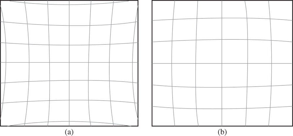 Figure 3.19 (a) Pincushion (positive) distortion. (b) Barrel (negative) distortion.