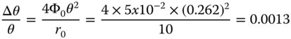 Worked Example 3.1 The distortion of an optical system is given as a WFE by the expression, 4Φ0c3pcosφθ3, where Φ0 is equal to 50 μm and c = 1. The radius of the pupil, r0, is 10 mm. What is the distortion, expressed as a deviation in percent from the paraxial angle, at a field angle of 15°? From Eq. (3.12) and when expressed as an angle, the transverse aberration generated is given by: