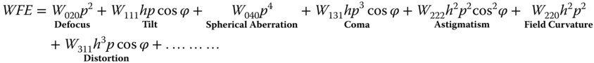 The list below sets out the WFE dependence of the five Gauss-Seidel aberrations on pupil function, p, and field angle, θ.