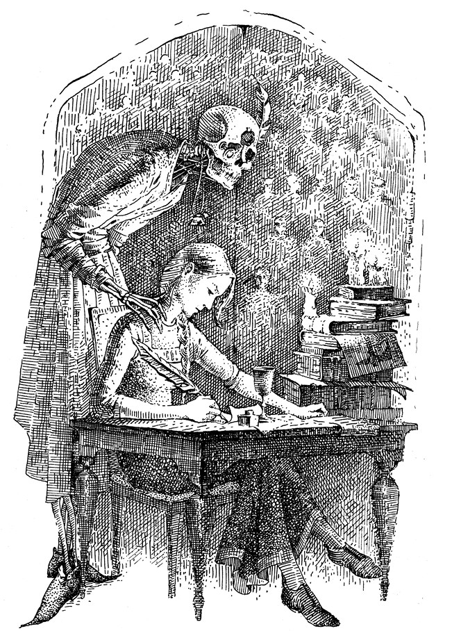 Владельцем рубиновых очей оказался сгорбившийся Бессмертный. Одет был сын Самой Седой Смерти в выцветший узорчатый халат, обмотанный нитями по закатанным рукавам и поясу. Под длинной полой, тянущейся за библиотекарем хвостом, стучали об пол грубые башмаки. Лик был прикрыт толстенной книгой, число закладок в которой придавало ей вид пёстрого ковра со множеством кисточек. На лбу Бессмертного стояла восковая печать с тонкой, от руки исписанной лентой пергамента, разделяющей лицо до отсутствующего носа. На правом виске – перо для письма, на левом – миниатюрная чернильница, окаймлённая золотом. Белый череп поддерживали серебряные спицы, идущие от лопаток и грудины до скул и нижней челюсти, с них свисали тонкие медные пластинки. Странного вида устройство, напоминающее подзорную трубу с полдюжиной линз, обрамляло левый глаз Краплака. Неведомый агрегат тихо пощёлкивал выпуклыми стеклянными дисками.