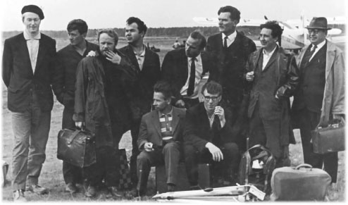 Творческая командировка писателей в аэропорту. Третий справа А. Яшин, левее А. Романов, В. Коротаев, В. Белов, Л. Беляев, сидят Б. Чулков, С. Чухин