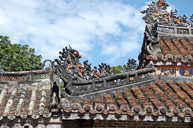 Запретный город представляет собой скопление оригинальных строений из темного дерева – они разбросаны по огромному парку с беседками, прудами, речушками и мостиками. Одни здания, вытянутые на десятки метров и декорированные разноцветной черепицей, предназначались для жизни императорской семьи и придворных. Другие служили (и продолжают служить) местом религиозных отправлений. Там находятся внушительные, в человеческий рост, алтари, напоминающие резные комоды на гнутых ножках. Как правило, на них стоят большие бело-голубые вазы, курильницы с множеством зажженных ароматических палочек и небольшие блюда с фруктами: вьетнамцы приносят их в жертву своим некровожадным богам.