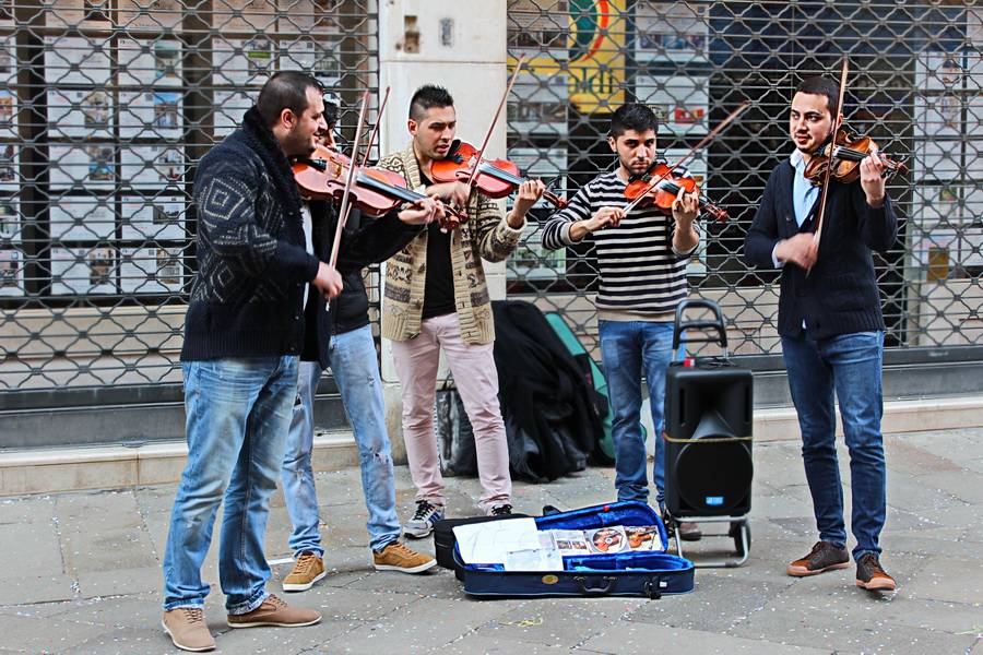 Увлекаемые потоком венецианцев и туристов, мы добираемся до конца рынка с его какофонией звуков и сворачиваем на беспорядочно ответвленную улицу, где опять мало людей. Витающее в воздухе ощущение музыкальности постепенно уплотняется и наконец-то материализуется в звуках живой музыки. Это квинтет уличных скрипачей исполняет зажигательную мелодию явно средиземноморского происхождения. Мы с улыбкой проходим мимо, бросая в раскрытый футляр монеты в один-два евро: они со звоном ударяются о горсть уже лежащих на дне денег, обогащая пьесу новыми звуковыми нюансами.