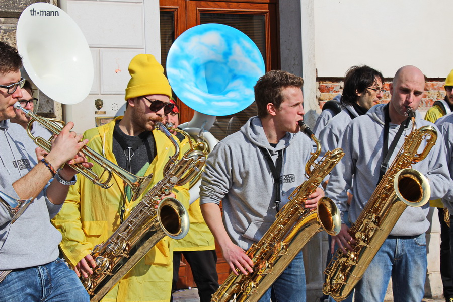 Открытие карнавала состоялось прямо на нашей Fondamenta di Cannaregio, и будь у нас в номере балкон, выходящий на набережную, мы могли бы наблюдать праздничную «движуху», не покидая отеля. Многие венецианцы так и поступали: причудливо разодетые, они целыми семьями выходили на балконы своих палаццо, облепивших канал с обеих сторон, и там вовсю дурачились. Они вели оживленную словесную перепалку с ряжеными персонажами, что расхаживали по набережной. Тон для их «перебранок» задавали два веселых оркестра: они тоже состязались друг с другом, стоя на противоположных берегах. На нашей стороне музыку выдавали парни с духовыми инструментами, а бойкий диалог с ними вели барабанщики в потешных желтых балахонах.