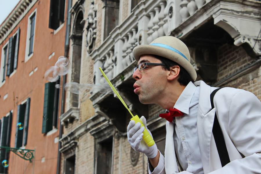 Во время карнавала люди готовы на всяческие ухищрения, лишь бы на них обратили внимание. Этому весьма способствует конкурс карнавальных костюмов – каждый раз он привязан к какой-то определенной теме. Например, в год нашего путешествия наряды участников представляли собой вариации на тему «Природа». Несомненно, фантазию людей стимулирует денежный приз, предусмотренный за лучший костюм, но многие и без этого охотно рядятся кто во что горазд и выходят на улицу, создавая необыкновенно праздничное настроение. Венеция и в обычное время – словно сцена с грандиозными декорациями, но когда ее наводняют люди в масках и костюмах разных эпох, ощущение театральности усиливается в разы.