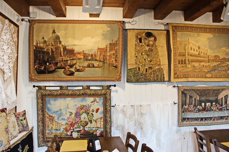 На острове Торчелло мы заглянули в одну маленькую забегаловку. Там стояло всего четыре обеденных столика, зато стены были увешаны гобеленами с видами Сан-Марко и прочими достопримечательностями Вечного города. На полках стояли в ряд диванные подушки с вышитыми карнавальными масками, а на черных бархатных щитах красовались белоснежные салфетки из буранского кружева. Под товар приспособили даже деревянную лестницу, что вела на второй этаж: на плечиках, прикрепленных к перилам, висели стильные вещи дамского гардероба с элегантными ценниками. Я не удержался, купил здесь небольшой гобелен «под старину» и миниатюрную подушечку, на которой была вышита люрексом венецианская красавица.