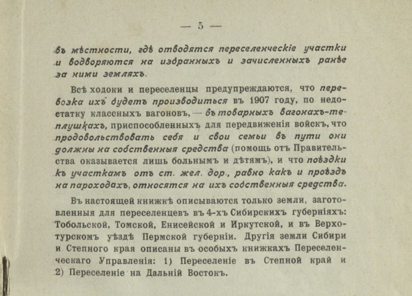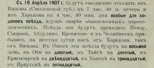 Все ходоки и переселенцы предупреждались, что перевозка в 1907 году будет осуществляться, по недостатку классных вагонов, в товарных вагонах – теплушках, приспособленных для движения войск, что продовольствовать себя и свои семьи в пути они должны на собственные средства (помощь от правительства оказывается лишь больным и детям, и что поездки к участкам от станций железной дороги, равно как и проезд на пароходах, относится на их собственные средства).