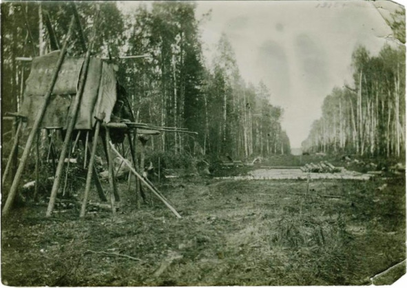 1910 год. Нихворо-пограничная дорога Туринского уезда. Подкур от комаров перед отъездом на работу. Небольшой шалаш на длинных жердях, обтянут тканью (сооружение напоминает избушку на курьих ножках).13