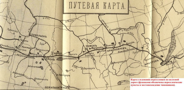 Карта следования переселенцев по железной дороге, флажками обозначены переселенческие пункты и местонахождение чиновников