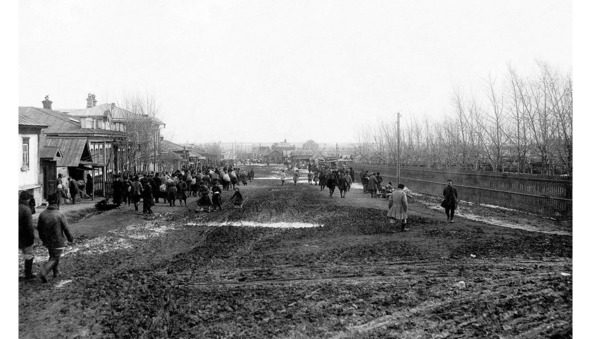 Шоссейная улица (ныне ул. Цвиллинга), Челябинск 1909—1919. Улицу замостили в начале ХХ века. По ней шли переселенцы с переселенческого пункта в город