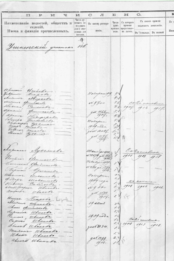 Все переселенцы зачислены на участок по Распоряжению от 17.07.1908 за номером дела 28957, дело 2939/1907. Льгота предоставлена с 1908 года, денежные средства подлежат зачислению в 1913 – в ½ оклада, в полный оклад – в 1918.