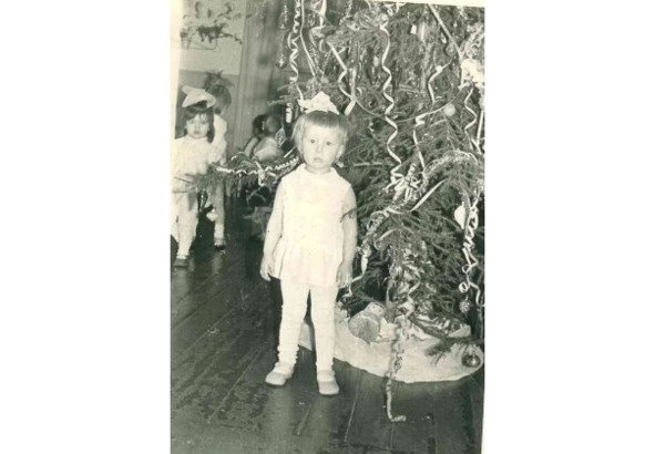 Мама привела меня и сказала, что будет весело, так как здесь много детей, с которыми я подружусь. В эти радужные перспективы мне сразу как-то не поверилось. Меня подвели к ёлке, чтобы сфотографировать. Я старалась отойти от неё подальше, т.к. ветки кололи спину, но воспитатель настояла, и ёлка впилась мне в руку (ну или мне так, казалось). Эмоции на лице у меня соответствующие. На попытки возразить нахождению в неприятном суетливом месте мне показали девочку и сказали, что она будет моей подругой, и её зовут Аста. (На заднем фоне моя предполагаемая подруга Аста, с которой мы так и не подружились).