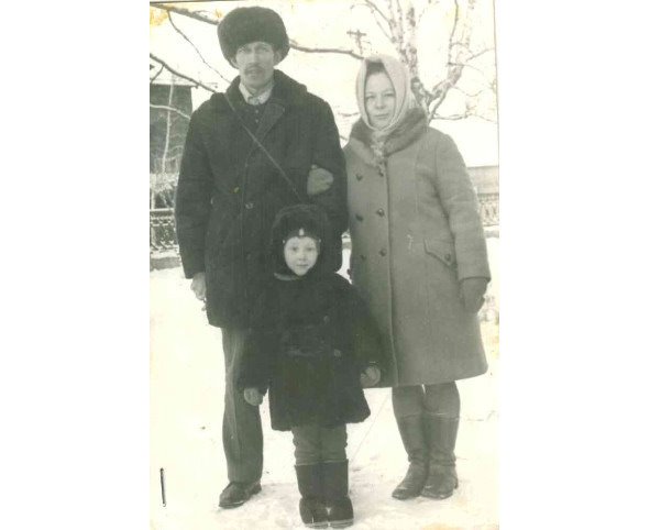 Городилов Василий Николаевич – мой отец, мама Тамара Александровна и я – в заячьей шапочке и в синей вязаной феске с белой полосочкой посредине. На улице конец ноября 1973 года и сильный мороз. Пальто у мамы цвета кофе с молоком. Воротник соболий, подстрелил на охоте дедушка Саша. У нас дома даже на тапочках были помпоны из соболя. И мои куклы носили одежду из этого дорого меха. Сквер железнодорожного вокзала в г. Серове. За спиной отца виднеется часть здания милиции, где впоследствии работала мама. Фотография сделана во время проводов маминого брата Коли в армию. Мне 4 года. Я помню этот день, как будто это происходило сегодня. Помню гостей в нашем маленьком однокомнатном домишке, Колькиных друзей и заплаканные глаза бабы Кати.