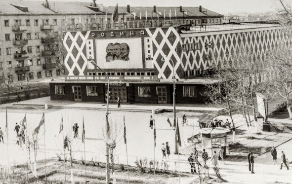 Справа фото кинотеатра Родина, г. Серов, именно таким я его и запомнила: с изображением Карла Маркса, Фридриха Энгельса и Владимира Ленина. Справа где тополя, афиша, она рисовалась к каждому фильму художником и все с любопытством разглядывали, гадая о чём фильм, узнавая актёров. Чуть-чуть правее, за афишей, парикмахерская, а на заднем плане пятиэтажный дом, где жили родители моего отца: Городиловы Евдокия Сергеевна и Николай Ефимович.