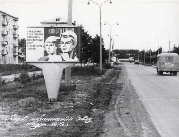 Город Серов, улица Красноармейская (микрорайон механического завода) с установленными баннерами вдоль дороги. 1979 год6