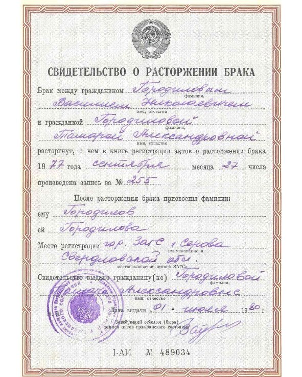 Свидетельство о расторжении брака родителей Городиловых Василия Николаевича и Тамары Александровны