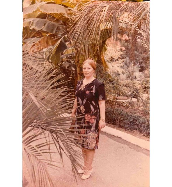 На фотографии, где мы все вместе – на маме желтое платье и яркие прозрачные такого же цвета бусы, актуальная причёска из длинных рыжих волос. Мама забирала волосы на макушке в хвост и равномерно распределяла волосы по голове. У меня свитерок под кофтой с изображением Чебурашки (жаль не видно), сверху полосатая кофта в любимом зелёном цвете.