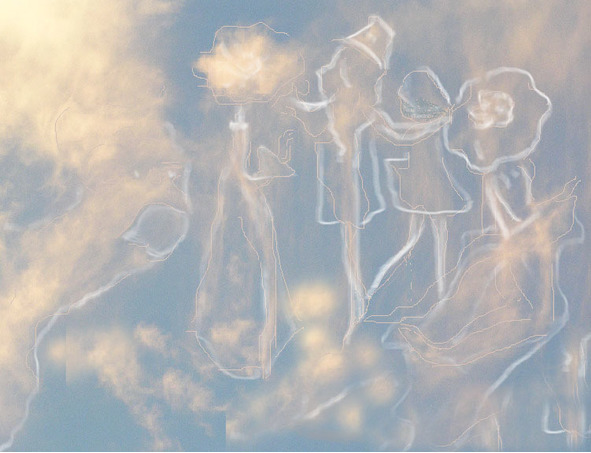 Под эти мысли я немного отвлеклась от зрелища, и когда снова посмотрела на небо, то увидела иллюстрацию к моей сказке, «Сказка Белого Облака» В этой сказке, девушки росинки испаряясь, превращаются в воздушных красавиц. Солнышко пригревает, и они плывут к небу на бал, который происходит раз в год на Белом облаке в его Замке. У девушек есть друзья-ветерки с поля, леса и озера. Они танцуют и разглядывают замок, прогуливаясь по его тропинкам и коридорам. Бродят по его сказочным залам и знакомясь с живущими на этом облаке. Они, даже, могут смотреть на землю, с края облака, как они это делают на картинке, которую я увидела.