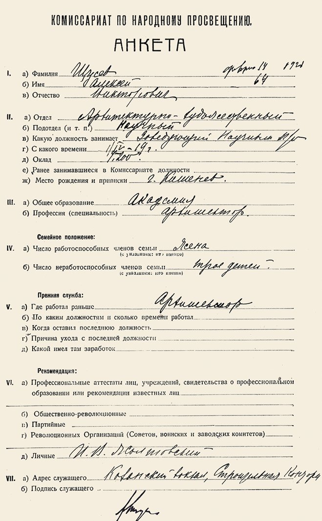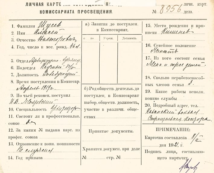Удостоверение, выданное народным комиссаром просвещения А. В. Луначарским художнику А. В. Щусеву, в том, что он является членом художественной коллегии Наркомпроса