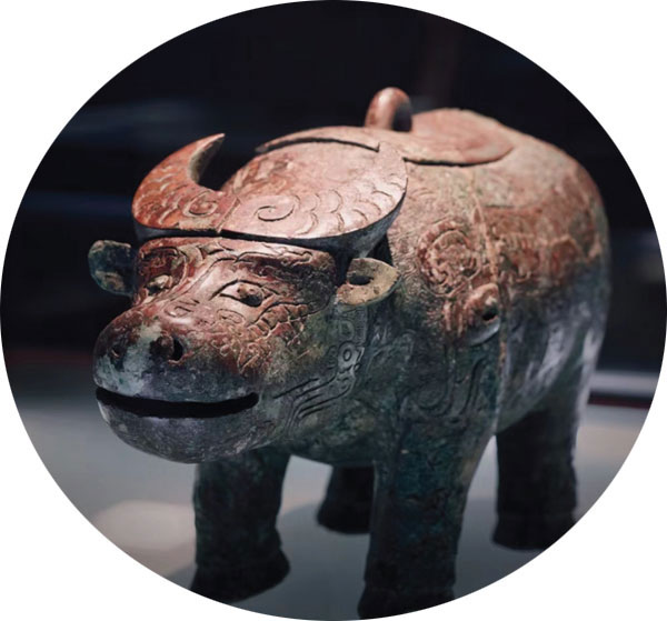 Пример высокого мастерства бронзового литья эпохи Шан: бронзовый бычок, найденный на раскопках города Инь. Использовался в качестве сосуда для вина. Музей руин Иньсюй