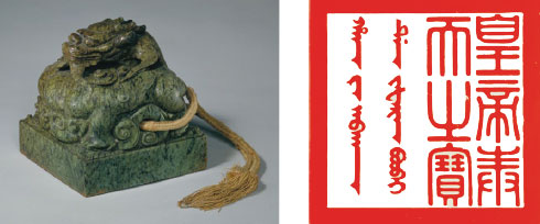 Нефритовая печать «Император почитает Небо» (皇帝奉天) с оттиском на китайском и маньчжурском языках. Выступала в качестве символа власти, дарованной императору Небом. Эпоха Цин. Музей Гугун, Пекин